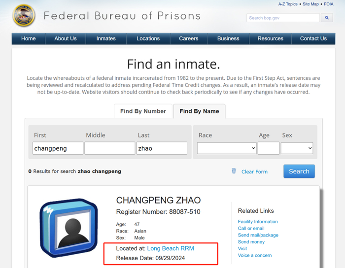记者在美国联邦监狱局(Bureau of Prisons)官网得知,赵长鹏当前的位置更新为位于加利福尼亚州中部的长滩居住地重返社会管理局(Residential Reentry Management,RRM)。这意味着他正接受重返社会前的准备和评估。如果一切正常,他将在9月29日重返社会。