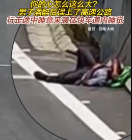 男子醉酒后睡在高速快车道 近日,云南,一男子酒醉后误上了高速公路,行走途中睡意来袭,在快车道内睡着了……民警赶到后将男子叫醒,经查看,男子无受伤情况。民警并对其进行批评教育后将其安全送回了家。(@中国警方在线)
