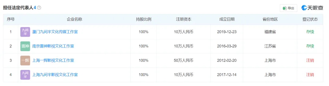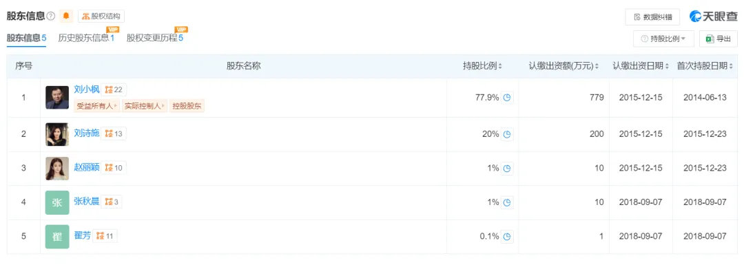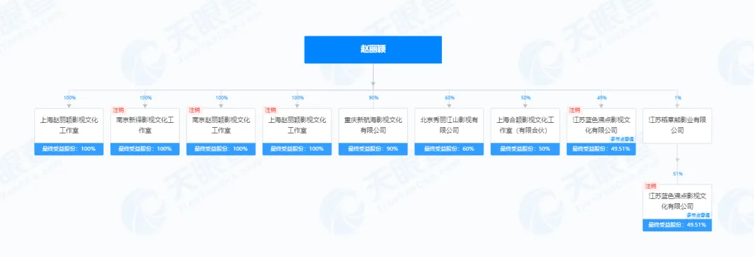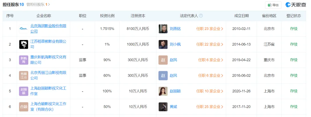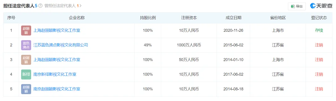 天眼查显示,赵丽颖曾担任5家公司的法定代表人,存续的上海赵丽颖影视文化工作室,由赵丽颖100%持股。