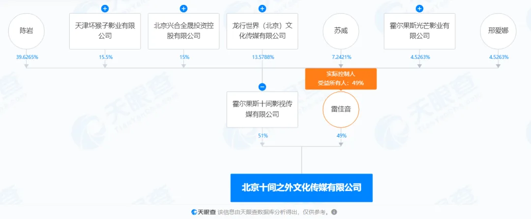 在娱乐圈摸爬滚打20年的雷佳音,喜欢和熟人一起做生意。雷佳音与制片人陈岩相识已久,俩人一起开公司——北京波诺文化。2017年,十间影视成立后,波诺文化改名为“十间之外文化”,雷佳音持股49%。