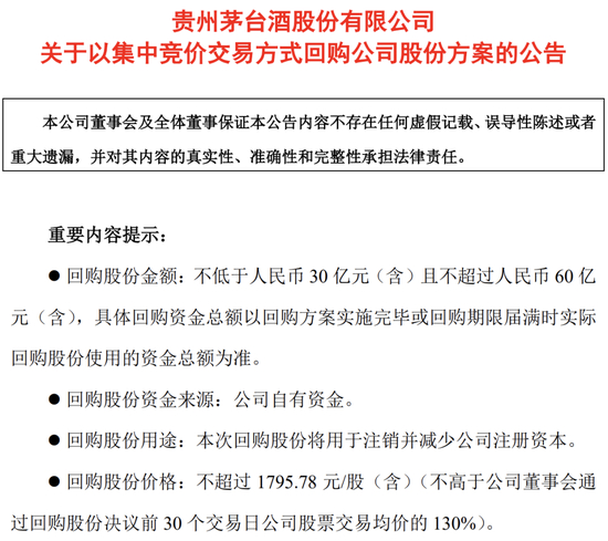 根据公告显示,贵州茅台将以自有资金回购不低于30亿不超过60亿的公司股份,回购价格上限为1795.78元/股。