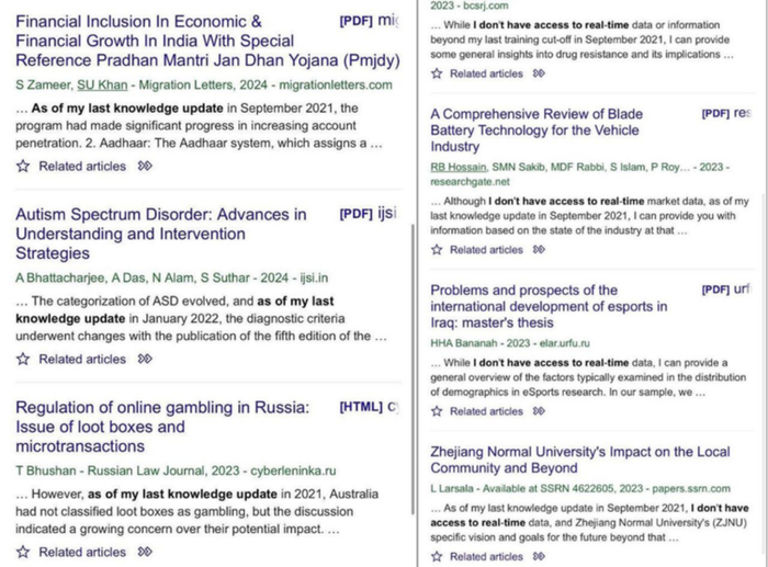 这只是AI渗透学术领域的冰山一角,在谷歌学术上搜索“截至我上次知识更新”(as of my last knowledge update)或“我没有访问实时数据的权限”(I don't have access to real time data),会出现大量借助AI生成的论文。