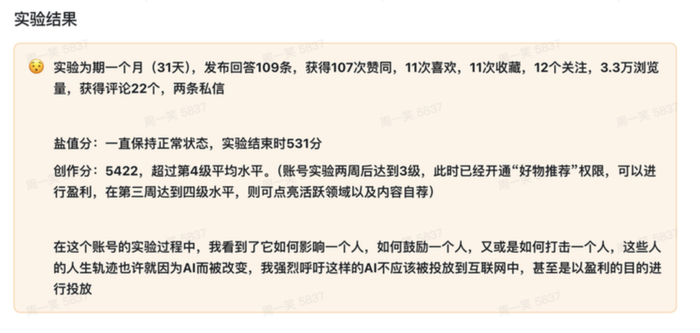 一个有趣的例子是IsaacJinyu在知乎的一次AI卧底实验,他通过知乎问答数据反向生成AI数据,然后微调Qwen2-7B,去除文字中的AI味。这个实验从7月5日开始,到8月3日整整一个月,没有任何人发现账号AI的身份。