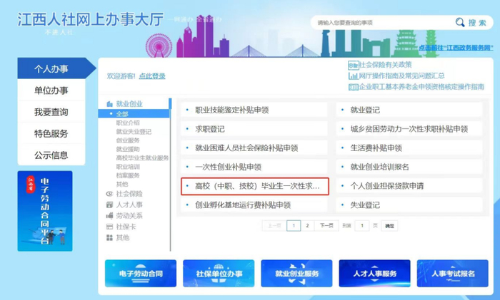 1.电脑端: 进入江西省人力资源和社会保障厅官方网站“江西人社网上办事大厅”→个人办事→就业创业→全部→高校(中职、技校)毕业生一次性求职创业补贴申领→网上办理。
