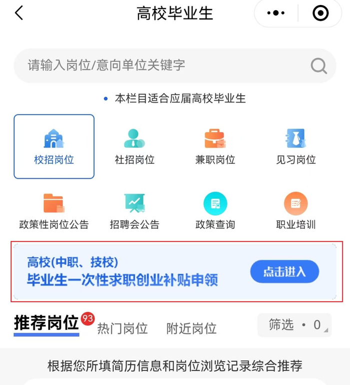 A.搜索微信小程序“江西就业之家”→高校毕业生→高校(中职、技校)毕业生一次性求职创业补贴申领→点击进入。
