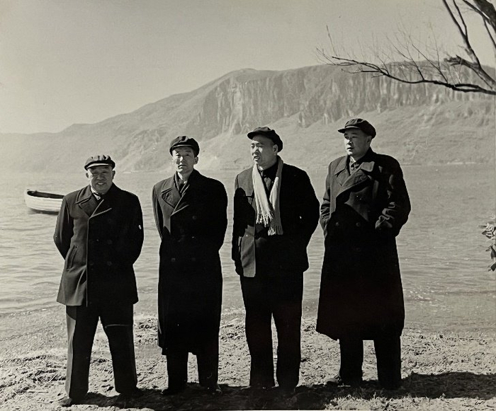 上面这张四人合影,因为水边风大,每人都戴一顶帽子,三人穿呢子大衣,袁勃系围巾一条,但袁勃的中山装、最左待考者露出的衣领和文中第一张合影一致,推测是同一天所摄。这张合影的构图颇讲究,微波泛起的滇池上,浮动着一只白舟,远处横亘着西山“睡美人”的身姿,天水皆苍茫。他们所处的位置,原本以为还是在西园,后面王健兄和笔者结合地图及相关老照片,断定是在现今的海埂公园,与西园隔水相望。市民多在此游泳、眺西山,还可赏晚霞与秋月。邓拓给《云南日报》社所写的条幅中,有一首耐人寻味的诗作《泛舟滇池有感》,与此照颇为应景: