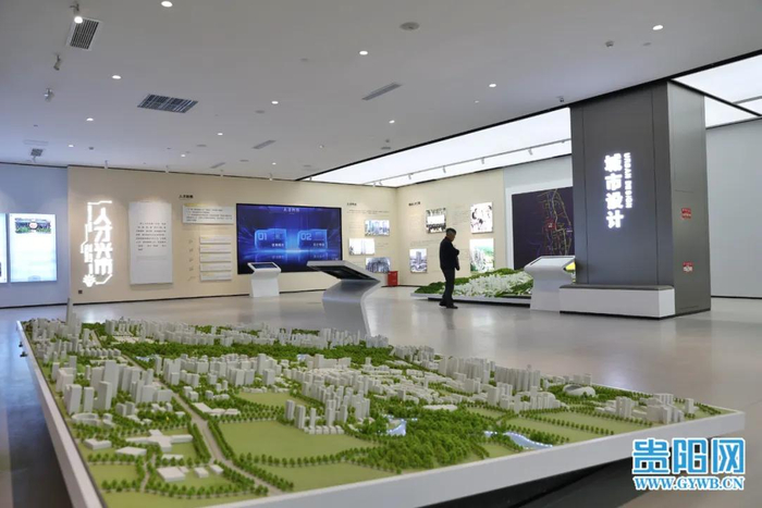 在展览馆中,物理沙盘与“奋进强省会,启航新征程”影片联动,描绘出未来贵阳贵安“一核三心多组团”的国土空间开发保护格局、“四山三水三湖”的自然生态格局。