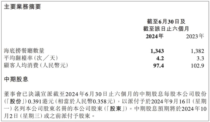 财报显示,截至6月30日,海底捞在大中华区共经营1343家餐厅,其中1320家位于中国大陆地区,23家位于港澳台地区。大中华区上半年所有餐厅接待顾客总数超过2亿人次,翻台率达4.2次/天,已接近2019年的巅峰期。