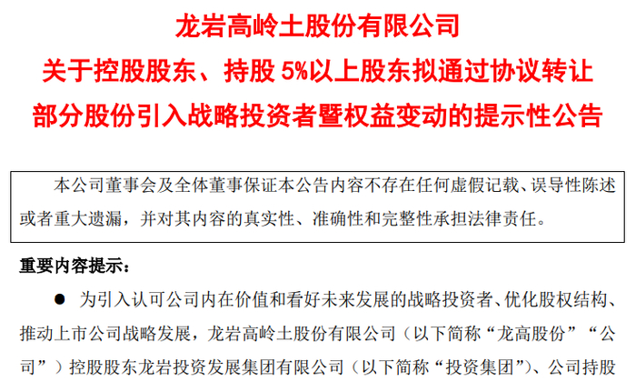 9月22日晚,龙高股份公告,公司前三大股东龙岩投资集团、龙岩文旅汇金、兴杭国投与紫金南投四方共同签署了《关于龙岩高岭土股份有限公司的股份转让协议》,后者拟合计受让龙高股份20%的股份。