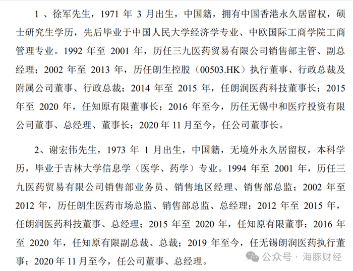 招股书披露的履历显示,1992年—2013年,徐军历任三九医药贸易有限公司销售部主管、副总经理;2002年至2013年,历任朗生控股(00503.HK)执行董事、行政总裁及附属公司董事、行政总裁;此后,徐军离职出走独立创业,创办朗润医药并收购知原药业。