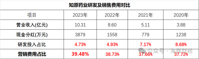 值得注意的是,徐军入主后的知原药业依然走的是销售驱动的老路。2020年—2023年,知原药业营销费用占营收的比例均在37%以上,而且逐年增加,2023年几乎接近40%。而同期研发开支占比则逐年降低,从2020年占营收比例8.7%下降至2023年的4.7%。从中可以看出,虽然徐军带领的团队收购了一个医药研发生产公司,但其本质上仍然是一家销售驱动的医药推广公司。
