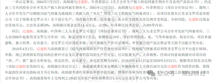 裁判文书显示,2005年12月,江苏圣宝罗药业(知原药业前身)时任大股东过建阳与高炳源以及第三人叶萍和签订《项目合作协议书》,载明三人合作开发生产以腹股沟疝气网塞为基础的三类植入性“补片”项目。该项目挂靠在江苏圣宝罗药业有限公司名下进行生产。同日,过建阳、高炳源、叶萍和三人与圣宝罗公司签订《项目挂靠协议书》,载明三人与圣宝罗公司合作开发疝气网塞项目,三人自2006年起租用圣宝罗公司车间一间,租金为每年2万元,租期暂定10年。项目所用的水、电、气等单独装表,按实计收,项目单独建账、独立核算、自负盈亏。圣宝罗公司在项目申报、医疗器械生产许可证增项、申领独立的产品注册证等方面予以配合等内容。