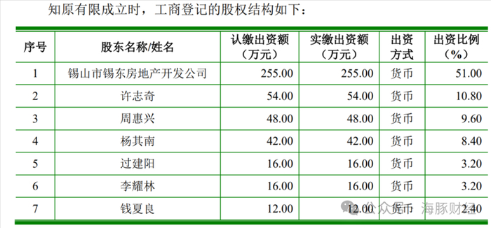 知原药业的前身为江苏圣宝罗药业,后者成立于1999年3月,股东包括锡山市锡东房地产开发公司(即“无锡市坊前房地产开发公司”)以及过建阳、黄炳贤、阮春良、周卓均、夏玲、孙凤娟、许志奇、杨其南、李耀林、汪安乾、钱夏良、许锋、周惠兴13名自然人,注册资本为500万元。其中,坊前房地产持股51%,许志奇持股10.80%,周惠兴持股9.60%,杨其南持股8.40%,过建阳持股3.20%,其余自然人合计持股17%。