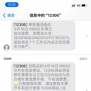 童先生提供的12306短信截图显示,已购联程车票,请在联程车票开车前自行登录12306网站(含12306移动端)与G8282次和D9562次列车车票一并办理退票,均不收取退票费。