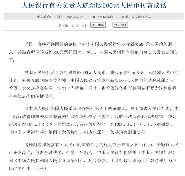 “发行大面额新版人民币”的消息是陈年旧谣,隔三差五就会出现,已经被屡次辟谣。例如500元的票样早在2006年就被官方辟谣称,系网民编造。