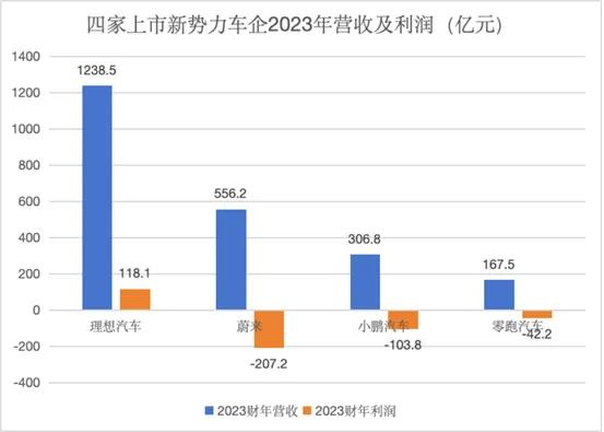 2023年,理想、蔚来、小鹏、零跑四家造车新势力巨头,除理想实现年盈利外,其余三家均处于亏损状态,小鹏汽车亏损103.8亿元,蔚来年亏损207.2亿元近乎是其两倍。
