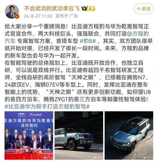 前不久,比亚迪方程豹与华为乾崑智驾正式官宣合作,首搭车型为豹8