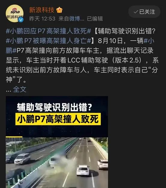 2022810日,一辆小鹏P7在开启辅助驾驶时,在宁波高架桥上将一男子撞飞致死。