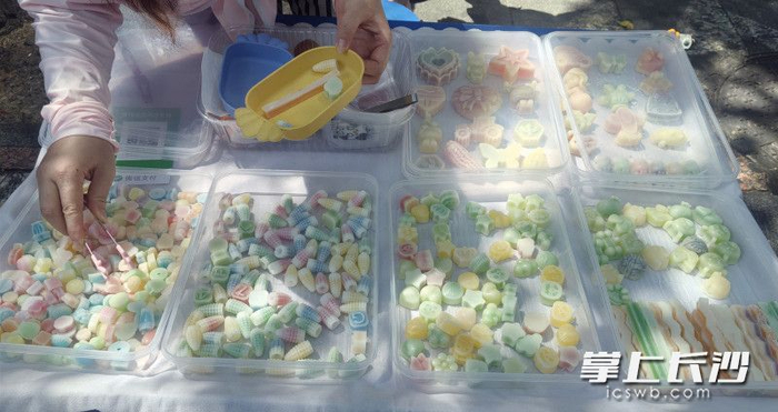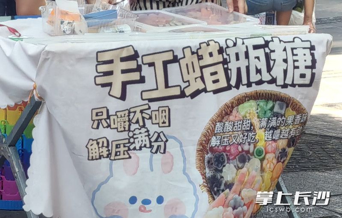 “我吃一个蓝色的,应该是蓝莓味道的,里面的酱是酸的,外面的蜡很有嚼劲。”在长沙五一广场附近,游客吴女士在一个摊位前挑选了三四个不同颜色、不同形状的蜡瓶糖。她表示,这是第一次听说这个零食,好奇心驱使下买几个尝尝。