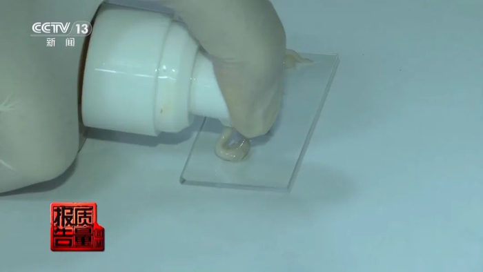 在检测机构记者看到,专业人员挤出样品里面的膏状物放置在专用玻璃片上,进行模拟阳光照射加速试验,6个小时后,这些膏状物颜色发生明显变化。
