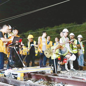 施工人员在进行道岔轨距及高差检测。 (陆新健 摄)
