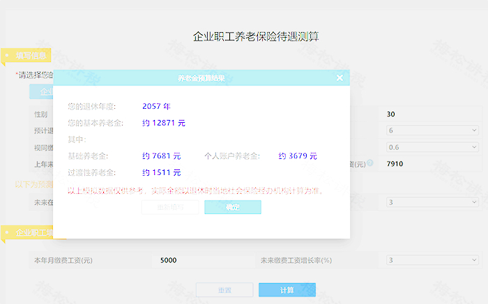 (注:这个计算器,只是根据我们的假设数据,推算出最终退休金。实际情况,可能和推算的会有差别。因此,举例仅供参考,每个人的养老金根据当地工资水平、缴费年限、缴费档次的不同,而不一样。)
