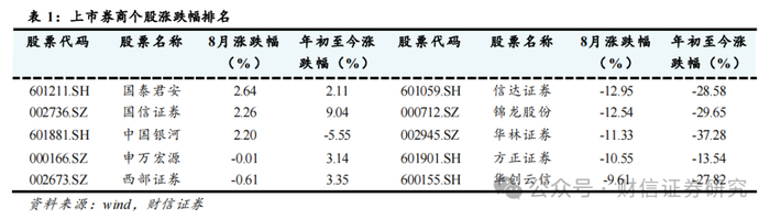 上市券商8月表现分化。行业涨幅前5位分别为国泰君安(2.64%)、国信证券(2.26%)、中国银河(2.20%)、申万宏源(-0.01%)、西部证券(-0.61%)。行业跌幅前5位分别为信达证券(-12.95%)、锦龙股份(-12.54%)、华林证券(-11.33%)、方正证券(-10.55%)、华创云信(-9.61%)。上市券商8月涨跌幅中位数为-4.44%。