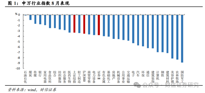 证券行业8月跑输大市。在31个申万行业指数中位列第14位,证券板块下跌3.75%。