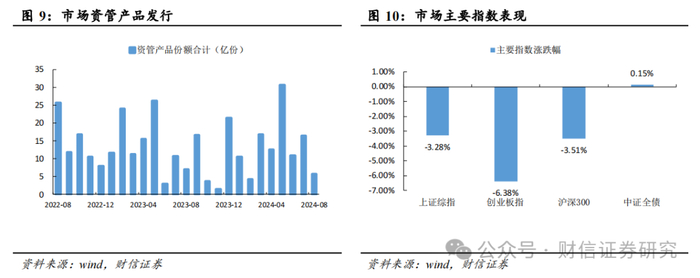(6)资管产品发行规模环比下降。8月成立资管产品38只,发行份额6亿份,发行份额环比下降66%;1-8月成立资管产品合计321只,累计发行份额108亿份,较去年同期下降2%。