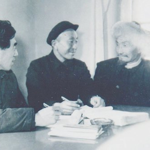 1979年,本文作者胡振华(左一)、中央民族学院(即今中央民族大学)教师沙坎·吾买尔(居中)与《玛纳斯》演唱大师朱素普·玛玛依(右一)在北京中央民族大学抢救《玛纳斯》