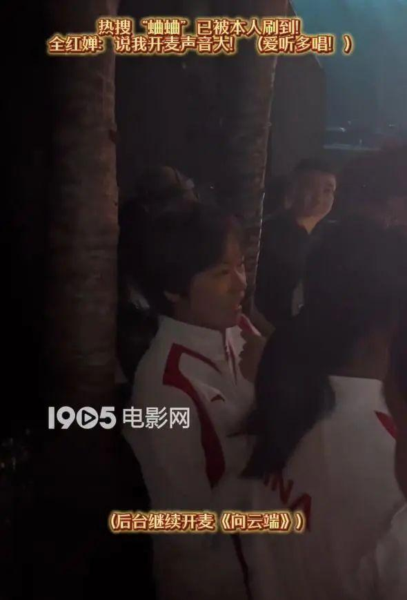 随后在后台的花絮视频中,全红婵回应了唱歌上热搜,说“说我的声音最大”。并继续自信跟唱《向云端》。
