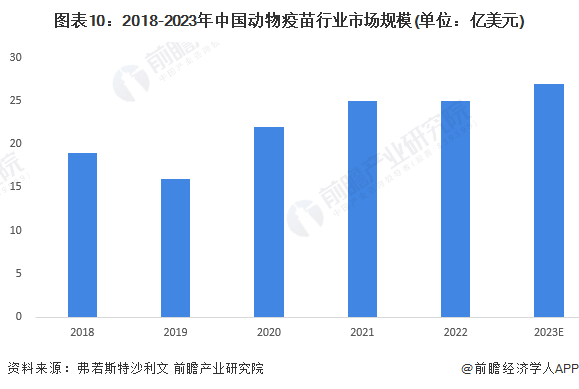 弗若斯特沙利文数据显示,2018年以来,中国动物疫苗行业规模呈现波动上升趋势。2022年,中国动物疫苗行业规模达到25亿美元,与2021年基本持平。初步统计,2023年中国动物疫苗行业市场规模在27亿美元左右。
