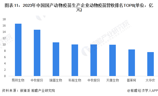 新猪派调研数据显示,2023年中国国产动物疫苗生产企业动物疫苗业务营收规模排名 TOP3的企业分别是易邦生物、中牧股份和瑞普生物,动物疫苗业务营收规模均在10亿元以上。