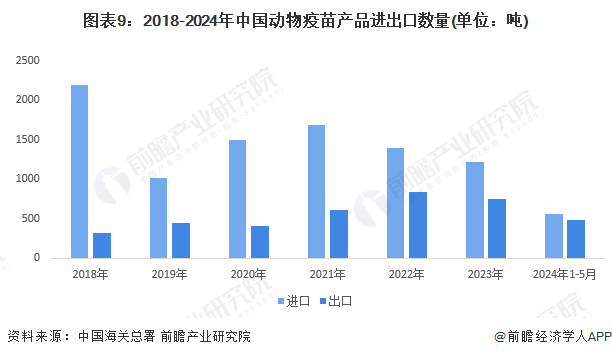 从进口方面看,2018-2023年中国动物疫苗的进口数量处于波动变化状态。2023年,我国动物疫苗进口量为1223吨,同比下降12.19%。2024年1-5月,中国动物疫苗出口量为561吨。