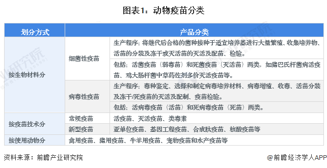 动物疫苗按生物材料分,可分为细菌性疫苗和病毒性疫苗两大类。按使用动物分可以分为禽用疫苗、猪用疫苗、牛羊用疫苗、宠物疫苗和水产疫苗等。按照技术可以分为常规疫苗和新型疫苗。