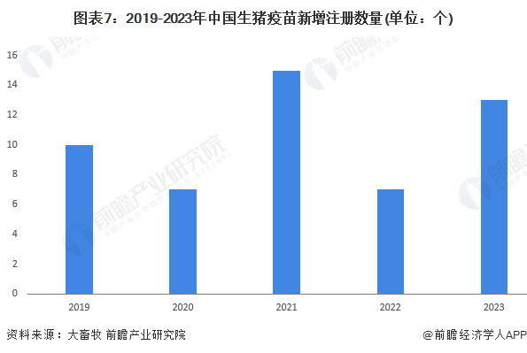 2019-2023年中国生猪相关疫苗新增注册产品数量合计达到52个,其中2021年新增注册数量最多,达到15个。2023年中国生猪相关疫苗注册数量达到13个,较2022年增加6个。