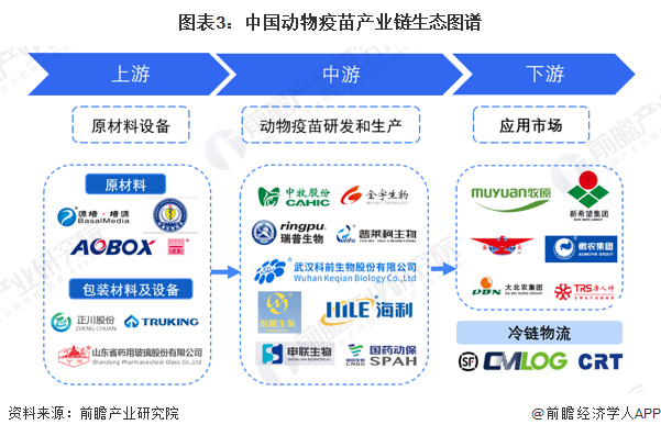 动物疫苗行业上游主要为疫苗生产所需用到的填料、培养基、胰蛋白酶等原材料以及生产设备和包装材料;中游为动物疫苗研发生产企业;下游为冷链运输及畜牧业、宠物行业等应用市场。