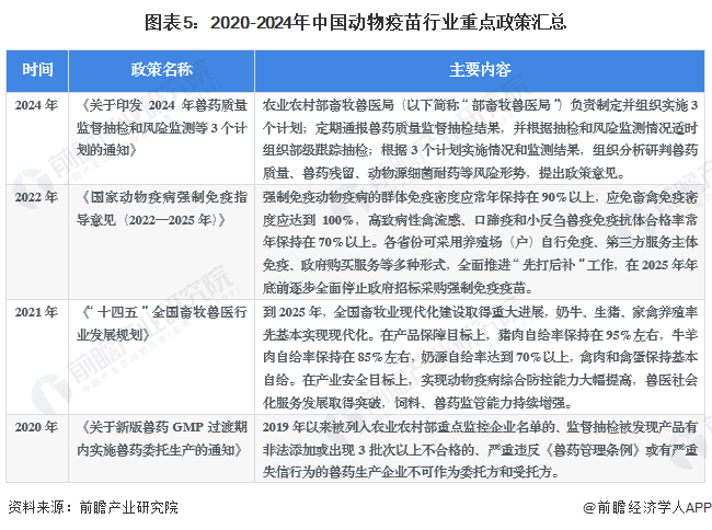 2020年以来,国家逐渐完善疫苗行业监管,陆续发布《关于新版兽药GMP过渡期内实施兽药委托生产的通知》《关于印发2024年兽药质量监督抽检和风险监测等3个计划的通知》等政策,提升动物疫苗产品质量。2020-2024年中国动物疫苗行业重点政策汇总解读如下: