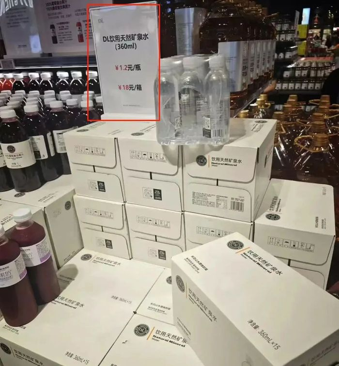 价格方面,DL饮用天然矿泉水360mlx15瓶一箱,售价18元/箱,折算下来,售价1.2元/瓶。