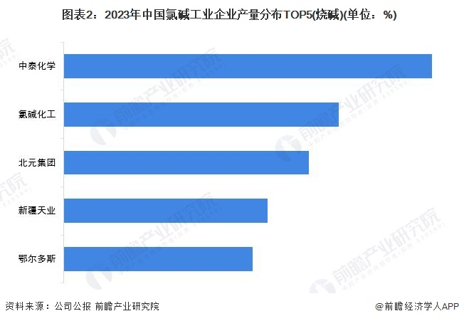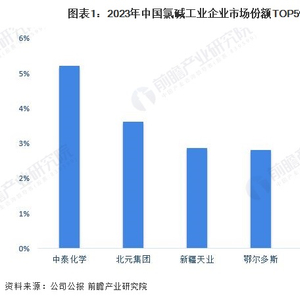 2023年,依据各上市企业的公报数据,中泰化学氯碱业务的市占率最高,为5.2%;其次为北元集团,市占率为3.6%。
