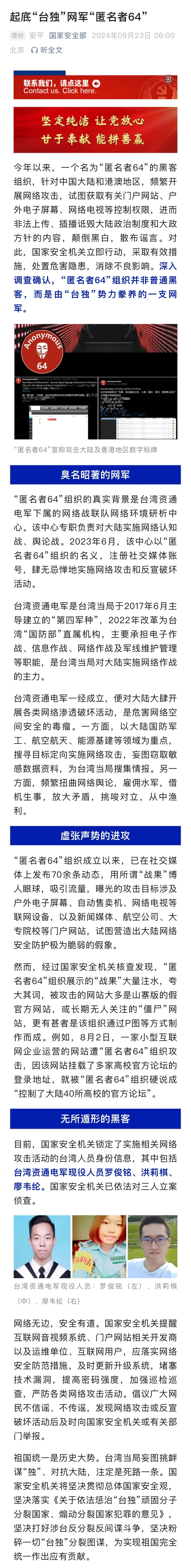 9月23日,国家安全部发文起底“台独”网军“匿名者64”:今年以来,一个名为“匿名者64”的黑客组织,针对中国大陆和港澳地区,频繁开展网络攻击,试图获取有关门户网站、户外电子屏幕、网络电视等控制权限,进而非法上传、插播诋毁大陆政治制度和大政方针的内容,颠倒黑白,散布谣言。对此,国家安全机关立即行动,采取有效措施,处置危害隐患,消除不良影响。深入调查确认,“匿名者64”组织并非普通黑客,而是由“台独”势力豢养的一支网军。