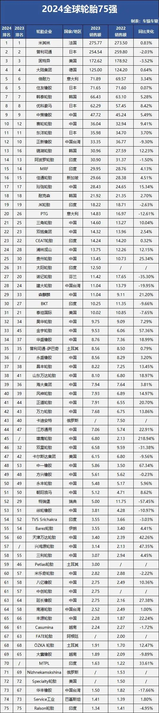 美国权威媒体《Tire Business》根据各企业2023年销售额发布最新全球轮胎75强。