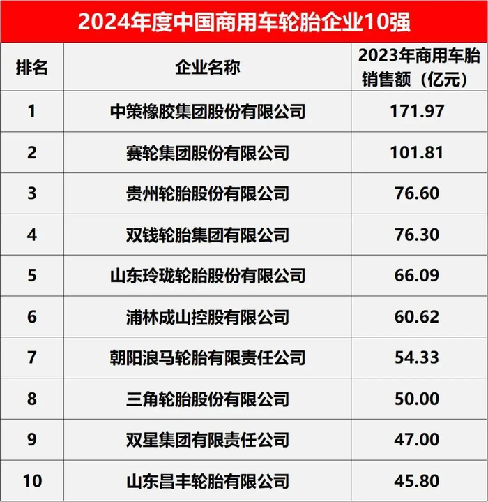 2024年度中国商用车轮胎企业10强