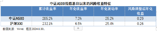 Wind显示,中证A500指数自基期2004.12.31以来,截至2024年8月底,年化收益率达到7.3%,同期沪深300指数年化收益为6.5%。在波动率方面,中证A500指数自基期以来的年化波动率为25.2%,低于同期沪深300的25.4%。综合收益与波动率,中证A500的风险调整后年化收益为0.29,而同期沪深300指数为0.26。因此,中证A500相较其它主要宽基指数,拥有较高的投资“性价比”。