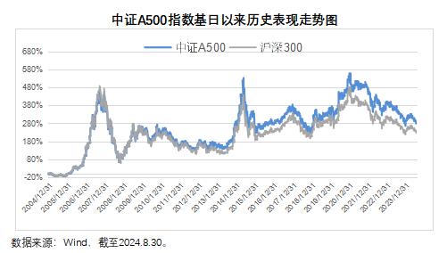 从基期以来的指数走势来看,中证A500指数前期走势与沪深300指数近似,近年来超赢逐渐明显,截至2024年8月底,中证A500指数基日以来累计超赢沪深300指数53.1%。韩秀一表示,二者表现差异的原因或在于,中证A500指数优先选取中证三级行业龙头,可及时纳入部分新兴领域的龙头公司,提升了对新质生产力的代表性,使得长期表现较优。