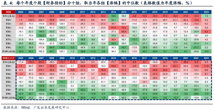 年度维度:ROE变化率(当期/上期-1)与市场涨跌幅之间的单调性很好,说明筛选ROE趋势向上的标的,获得超额收益的概率也更大。