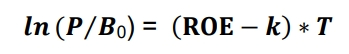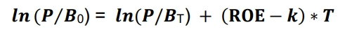 上述公式的含义:当前PB估值的自然对数,与预期ROE线性正相关、与投资者预期回报率k线性负相关。