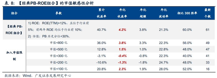 市场所关心的另一个话题是PB-ROE策略是否会体现出小市值效应。我们对三个组合做市值敏感性分析,结果显示: