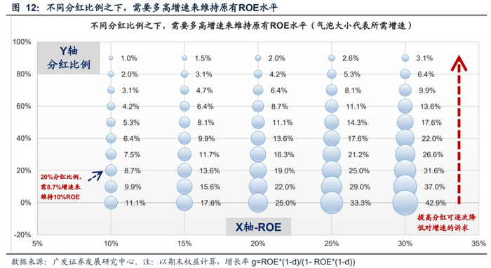 适当提升分红,可降低维持稳定ROE对增速的诉求。假设有一家公司ROE为16%,在可持续增长和30%分红比例的条件下,若想长期维持16%的ROE,则所需年均增速为12.6%。