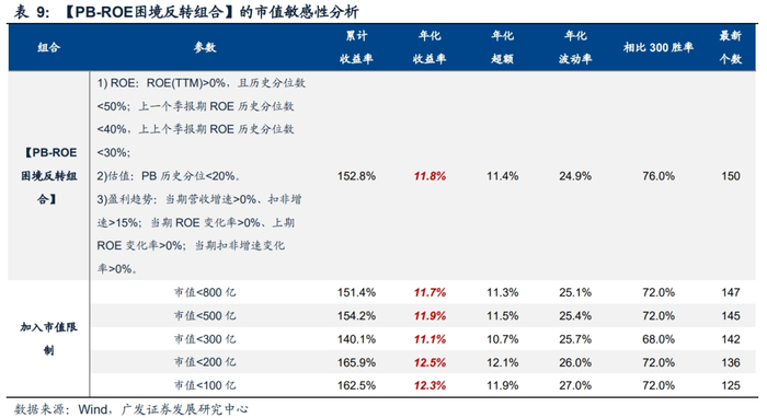 该组合放宽了对ROE的要求,但加入了对ROE周期底部反转可能性的判断(ROE位于历史低位,但短期有边际变化)。具体参数设定如下: